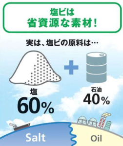 組成の約6割が塩に由来する塩素のため石油資源の節約に貢献し、製造時のエネルギー消費や環境負荷も少ない素材です。